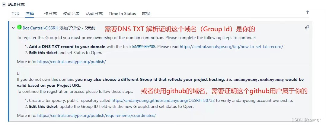 收到邮件后,可以登陆Sonatype查看你之前提交Issue。评论中会提示你验证域名的归属,如果是自己的域名,则去域名服务商那里的配置页面上加一条TXT解析记录,内容为类似这样的一串字符:OSSRH-80732。然后打开命令窗口,输入nslookup -type=TXT 域名,最终结果包含OSSRH-80732,则表示配置成功。