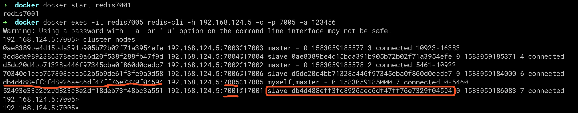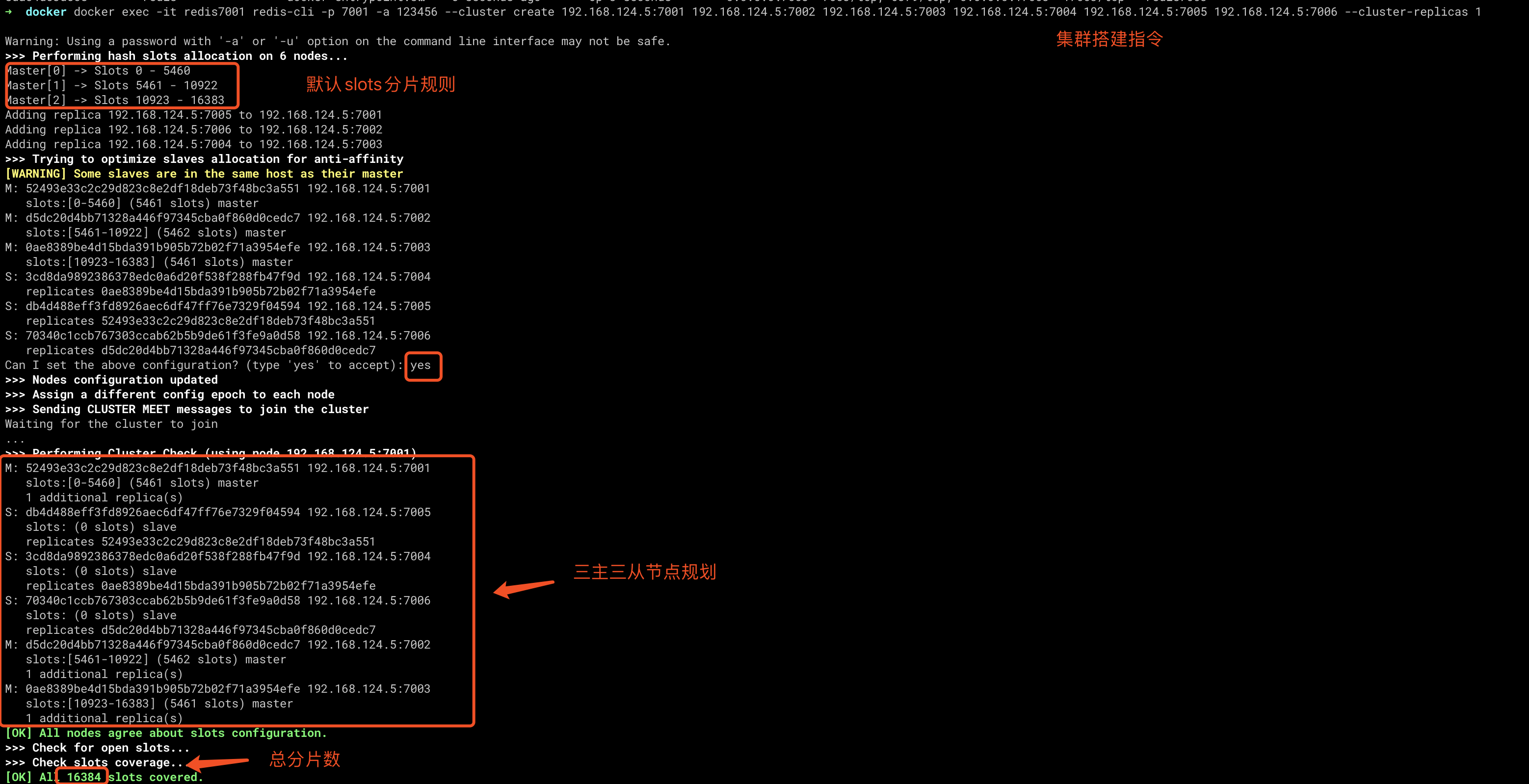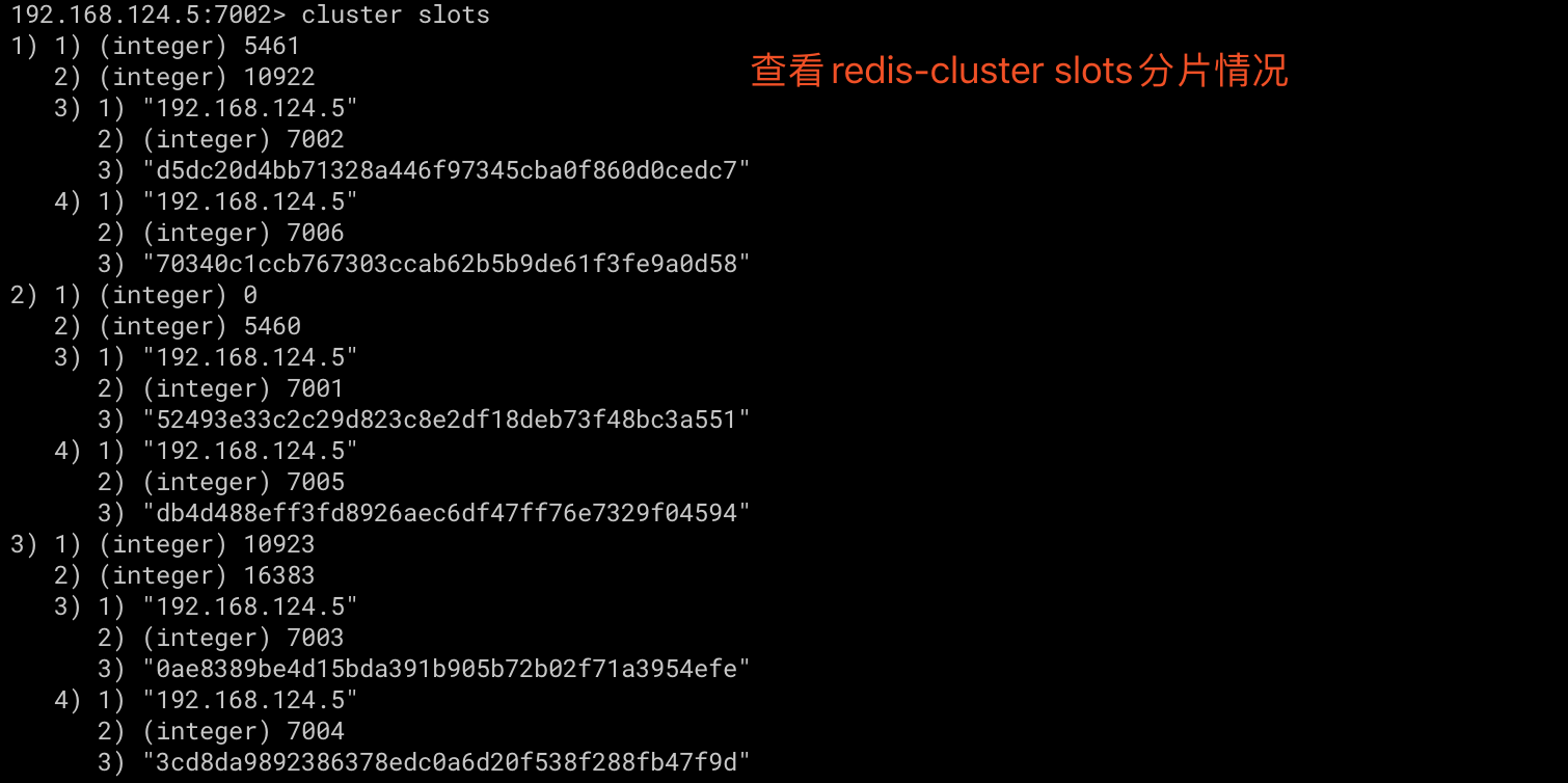 下边是我自己的环境docker exec -it redis7001 redis-cli -p 7001 -a 123456 --cluster create 192.168.124.5:7001 192.168.124.5:7002 192.168.124.5:7003 192.168.124.5:7004 192.168.124.5:7005 192.168.124.5:7006 --cluster-replicas 1