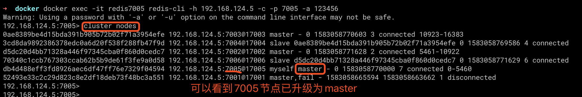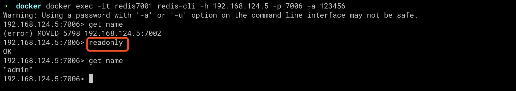 docker docker exec -it redis7001 redis-cli -h 192.168.124.5 -p 7005 -a 123456 ping |