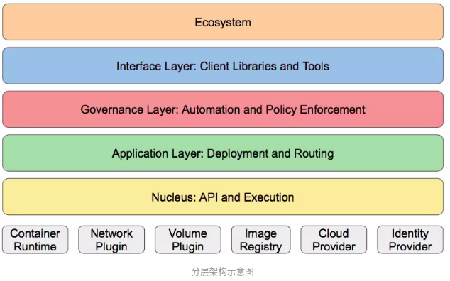 **管理层:**系统度量(如基础设施、容器和网络的度量),自动化(如自动扩展、动态Provision等)以及策略管理(RBAC、Quota、PSP、NetworkPolicy等);