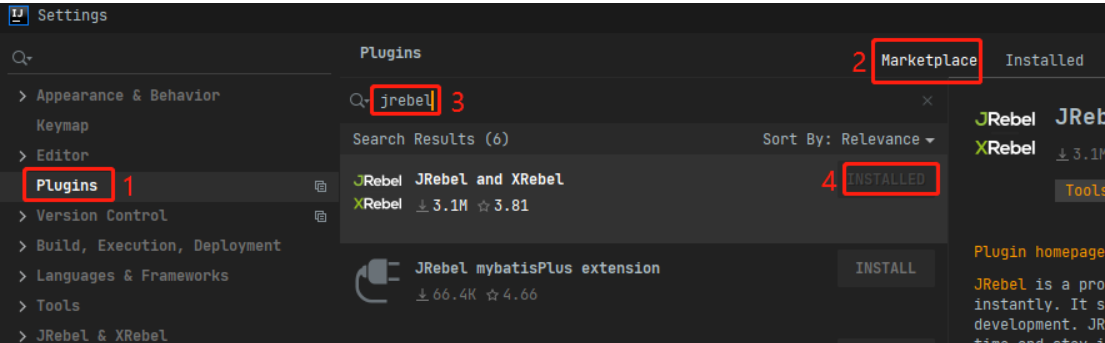 2、在搜索框输入 jrebel—>选择搜索结果—>点击 Install(安装),如下图。