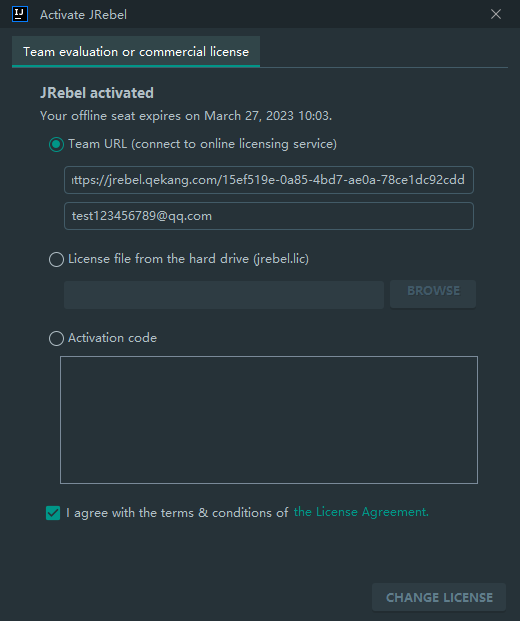 方法 2 与方法 1 类似,只不过最新版的 2022.4.2 这个版本的 jrebel 应该是更改了激活方式 qekang 方式激活不成功。