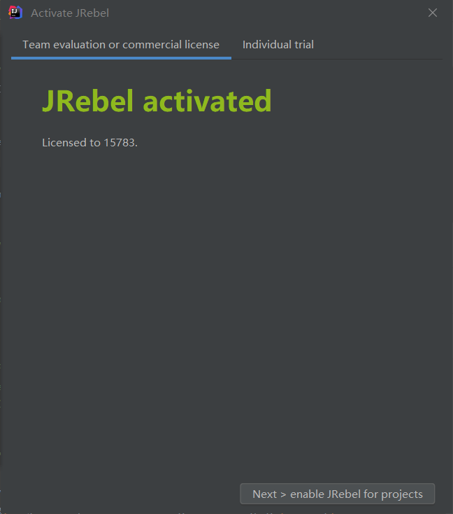 安装之后需要重启 IDEA,JRebel 插件会提示需要激活,点击 Jrebel Activation 进行激活。