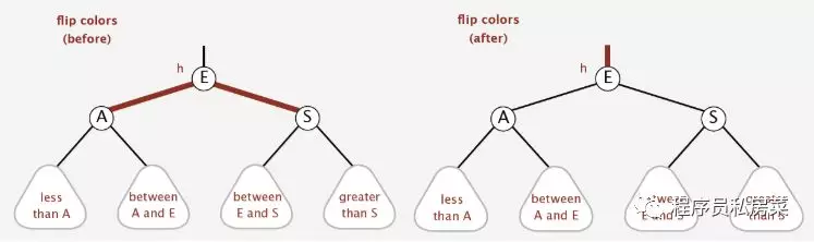 改变节点颜色比较容易理解,因为它违背了规则 3。假设现在有个节点 E,然后插入节点 A 和节点 S,节点 A 在左子节点,S 在右子节点,目前是平衡的。如果此时再插一个节点,那么就出现了不平衡了,因为红色节点的子节点必须为黑色,但是新插的节点是红色的。所以这时候就必须改变节点颜色了。所以我们将根的两个子节点从红色变为黑色(至于为什么都要变,下面插入的时候会详细介绍),将父节点会从黑色变成红色。可以用如下示意图表示一下:
