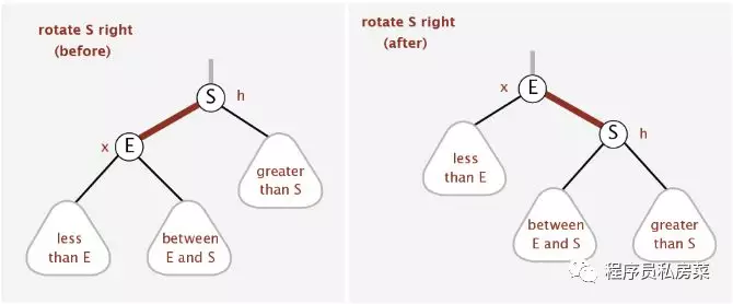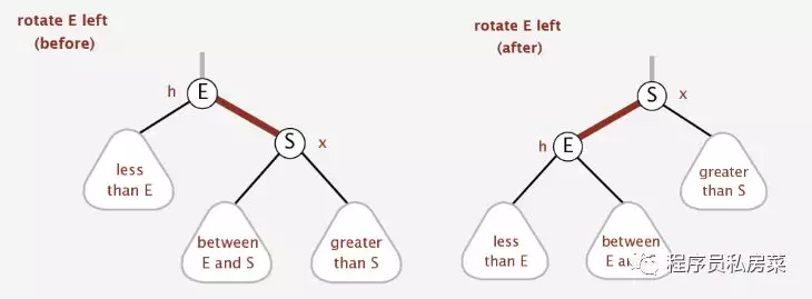 通常左旋操作用于将一个向右倾斜的红色链接旋转为向左链接。示意图如下: