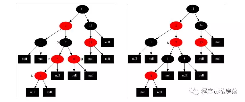 在红 - 黑树中插入的节点都是红色的,这不是偶然的,因为插入一个红色节点比插入一个黑色节点违背红 - 黑规则的可能性更小。原因是:插入黑色节点总会改变黑色高度(违背规则 4),但是插入红色节点只有一半的机会会违背规则 3。